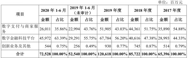 2020年1-6月,数字支付与商家服务营收260.11亿元,占总营收35.86%;数字金融科技平台营收459.72亿元,占总营收63.39%;创新业务及其他营收5.44亿元,占总营收0.75%。