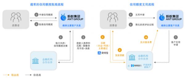 微贷科技平台中的主打产品即为花呗和借呗。用户使用花呗、或者借呗的整个流程中,金融机构除了负责发放贷款、做出信用额度决策外,还将支付给蚂蚁集团一笔技术服务费。