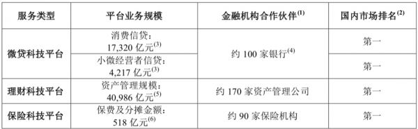 目前,微贷科技平台业务规模达到消费信贷17320亿元;小微经营者信贷4217亿元。和金融机构合作伙伴达到约100家银行。理财科技平台资产管理规模达到40986亿元,与约170家资产管理公司合作。而保险科技平台中保费及分摊金额达到518亿元,约和90家保险机构达成合作。