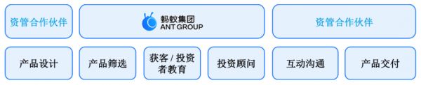 在整个理财产品体系中,蚂蚁集团主要作为资管合作伙伴的“助力者”角色,主要负责理财产品筛选、投资者管理以及提供智能投顾服务。而资产管理合作伙伴则负责产品设计、交付以及同蚂蚁集团平台投资者互动沟通。