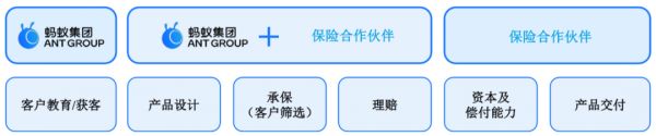 保险产品服务流程中,蚂蚁集团提供获客渠道,同时和保险合作伙伴一起进行产品设计、承保以及理赔环节;而保险合作伙伴则独立负责产品交付以及偿付环节。