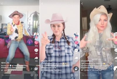 美国黑人小伙蒙太罗·拉马尔·希尔创作的歌曲《老城之路》上传至Tiktok后迅速走红,希尔本人由此进入美国主流音乐圈,成功与哥伦比亚唱片公司签约。希尔说:“Tiktok改变了我的命运。”图为Tiktok用户使用《老城之路》拍摄的牛仔换装视频。