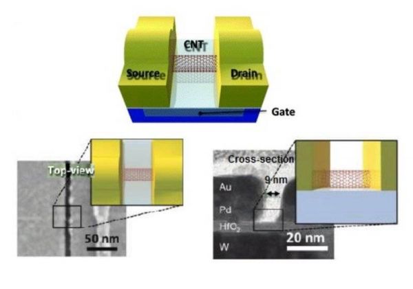 2012年,IBM研究人员制造出一个沟道长度为9nm的碳纳米管晶体管。这是世界上首个可以在10nm节点以下工作的晶体管。同年,IBM基于标准半导体制程,研究出将超1万个碳纳米管晶体管集成到一颗芯片中的技术。