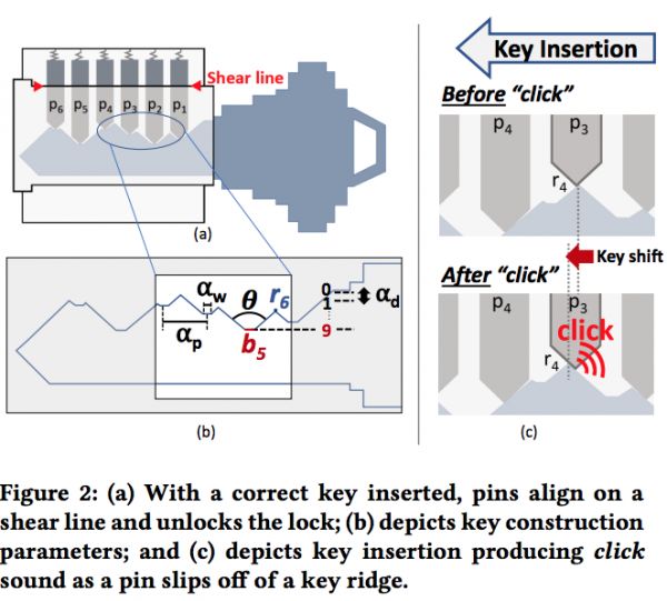 他们将研究重点放在一种常见的锁——Pin Tumbler Locks上,当你把钥匙插进去时,这种锁会发出咔嗒咔嗒的声音。