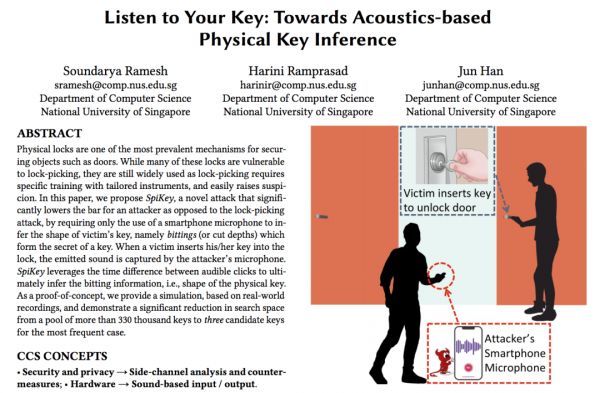 新加坡国立大学的研究人员Soundarya Ramesh、Harini Ramprasad、Jun Han发表了一篇名为《Listen to Your Key: Towards Acoustics-based Physical Key Inference》的论文,他们研究的是“基于声学的物理键推断”。