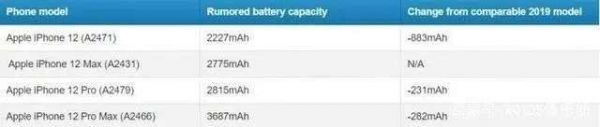 对此,部分昌硕产线员工确认,“iPhone 12电池显得更小。”韩国认证机构泄露的信息显示,电池容量方面,iPhone 12全系电池容量不但没提升,反而比前代都要低10%左右,具体而言,iPhone 12的电池容量将下降883mAh,iPhone12 Pro将下降231mAh,iPhone12 Pro Max将下降282mAh。