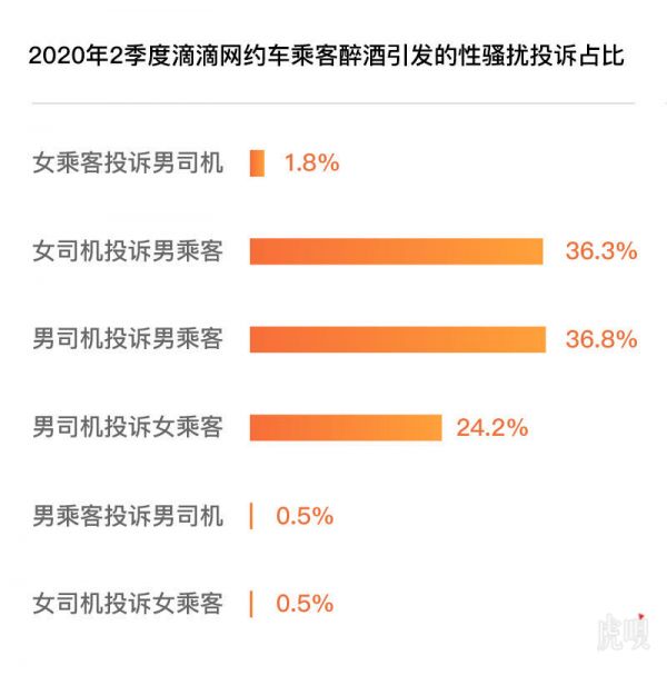 @虎嗅【滴滴发布2季度醉酒报告:近4成性骚扰为男乘客骚扰男司机】8月27日,滴滴发布2020年2季度《醉酒乘客安全透明度报告》,数据显示,网友投票“网约车10大不文明行为”中,酒后滋事位居乘客不文明行为第一名。因乘客醉酒引发的性骚扰投诉中,司机投诉乘客占比97.7%,乘客投诉司机占比2.3%。从性别上来看,男司机投诉男乘客占比最高,达到36.8%。紧接其后的是女司机投诉男乘客,占比36.3%,男司机投诉女乘客占比24.2%。