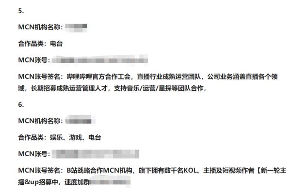 一位B站主播表示,B站做直播的试错成分更高,其中的大量工作由外包工会负责。在B站公开信息中,与官方合作的MCN机构将负责艺人经纪、平台管理、艺人招募、商务经纪、短视频营销等。