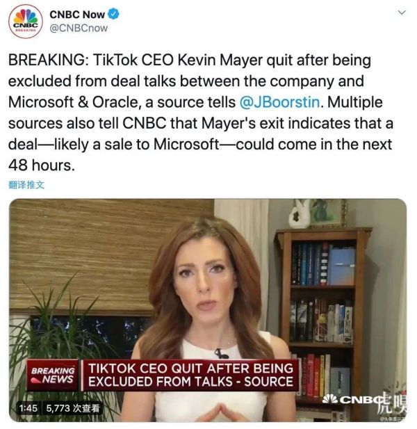 经过20多天,角逐TikTok的已经不止于微软一家。推特、甲骨文以及TikTok的投资人团队都曾被传出消息希望收购TikTok大量股份。最新的消息是,CNBC称梅耶尔的离职是因为被排除在公司与微软和甲骨文的交易谈判之外,伴随着他的离职,字节跳动与微软的交易可能会在48小时内完成。