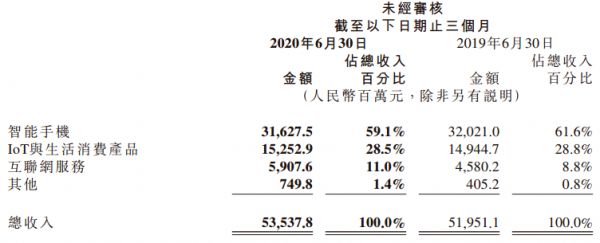 事实上,自上市以来,小米的营收结构一直都是一家硬件公司——在第二季度535亿元的收入中,其智能手机316.28亿元,占比高达59.1%。