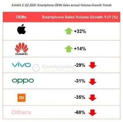 Counterpoint发布的《2020年第二季度国内智能手机市场报告》显示,华为整体市场份额达到46%、vivo占16%、OPPO占15%、苹果占9%,小米也是9%。
