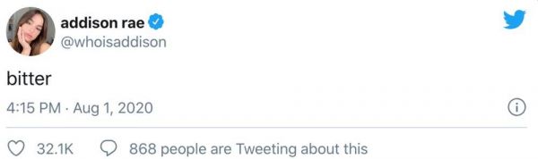 而粉丝数高达5750万的TikTok红人瑞伊,在新闻爆出后的几小时内,相继发布了“唉”“允许你自己难过吧”“苦涩”等多条推文。