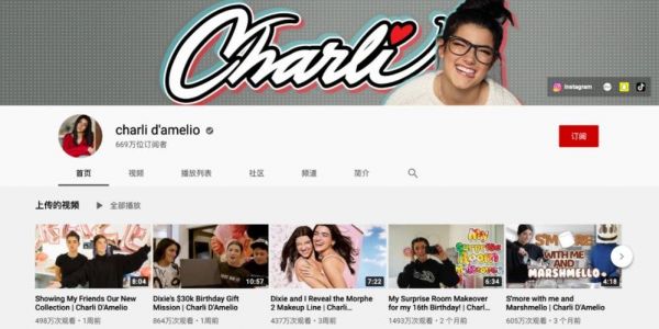 查莉今年也开始在YouTube上发布Vlog视频。她在TikTok积累起的名气和号召力,让跨平台创作变得轻而易举,查莉仅用12个视频就收获了近670万YouTube粉丝。而她的Instagram账号粉丝也有近3000万。