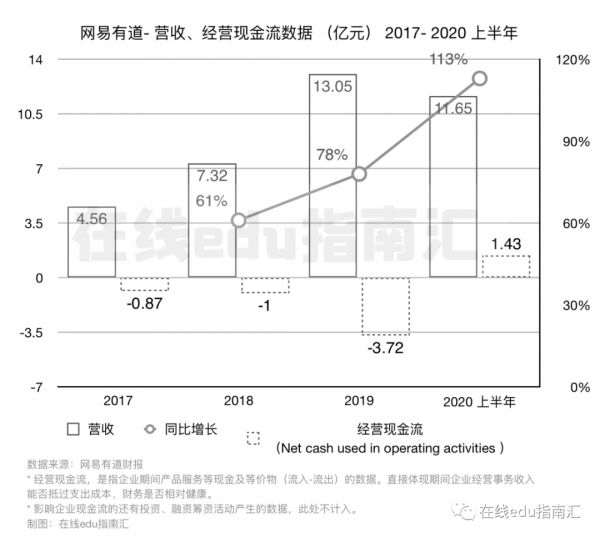 在体现“企业经营事务收入能否抵过支出”、财务是否相对健康的“经营现金流”指标上,有道首次进入净增状态:2020年上半年经营净现金流为1.43亿元,此前三年这个数据均是负数。