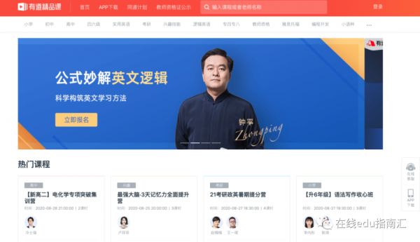 有道精品课,是以k12课程品类为重心的在线学习平台,提供k12的语数英、编程等课程及平台。k12主要业务模式,更接近双师直播大班课模式的“跟谁学”。有道的这一业务也解释了为什么这个以在线翻译、词典起家的公司,近年提及K12公司时,被纳入研究与对比的原因。此外,有道精品课还覆盖专业技能、外语课程、兴趣课程等等。