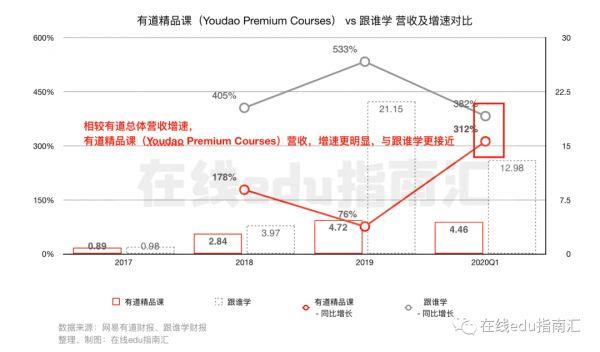 事实上,以K12有道精品课为核心不仅是2017年到2019年有道的“重要”转移方向,它在最近的当下,也是越来越“关键的增长变量”。以有道精品课数据为例,2020年Q1其营收增速达312%,“远超”有道总体营收的增长(140%),而且与今年二级市场表现“最亮眼”的跟谁学增速(382%)接近。