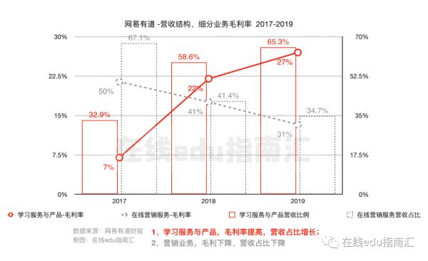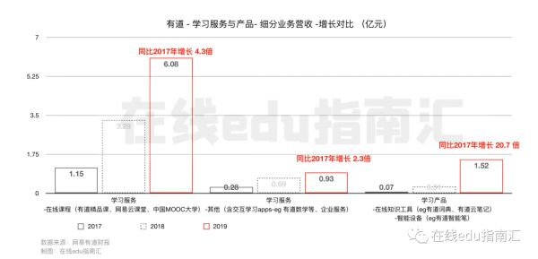 最核心的学习服务-在线课程(有道精品课、网易云课堂、中国大学MOOC),2017年到2019年增长4.3倍。