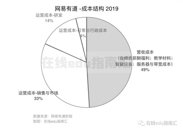 在有道的经营成本结构上,包含教师薪酬福利、教学材料、智能设备、服务器与带宽的营收成本占比在49%。在线教育公司最重的经营成本之一,销售与市场,有道公司成本比例约为营收的33%。