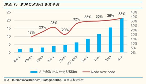 芯片代工厂商一旦进入先进制程,就要面临天量的“烧钱”:伴随制程工艺的技术演进,在 16/14 纳米以后的每个节点要增加投资超过 30%:设备投资递增,折旧费用大幅上升的情况下,连台积电的毛利率也会因新制程工艺的初期量产而下滑。