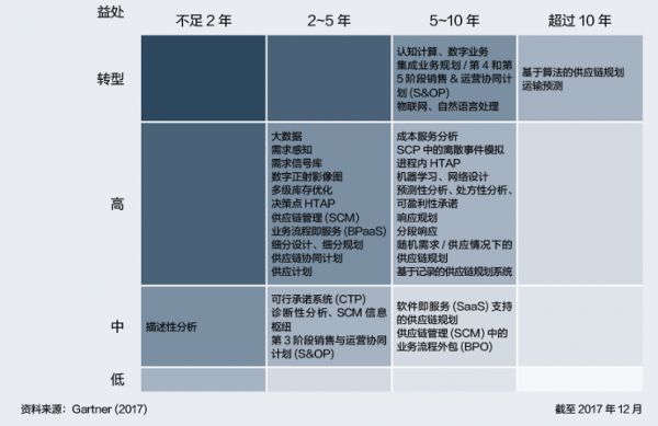 图 1 展示了未来10年甚至更远的未来,企业需要在各阶段采用哪些技术才能享有智能供应链带来的益处。