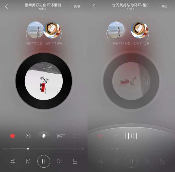 在“一起听”使用语音功能时,产品上会呈现一个向对方倾诉的动画;当不再说话时,两个头像又会重新恢复靠近。语音交流时,音乐并不会暂停,为了清楚传递语音内容,但不违背听歌的感受,音乐会变做音调更轻的背景音,还原真实的交流场景。