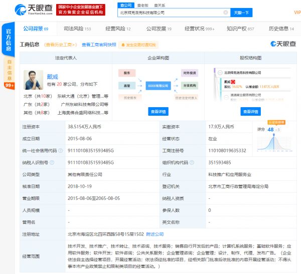 天眼查APP显示,北京拜克洛克科技有限公司成立于2015年8月,注册资本约38.52万人民币,公司经营范围包括:技术开发、技术推广、技术转让、技术咨询、技术服务;销售自行开发后的产品;计算机系统服务;基础软件服务等。在其股东信息中,戴威持股36.02%为该公司最大股东,第二、第三大股东为滴滴商业服务有限公司、北京经纬美创科技有限公司,持股比例分别为25.32%、10.15%。