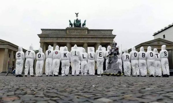 3月21日,“阻止杀人机器人”运动的抗议者在柏林举行抗议活动