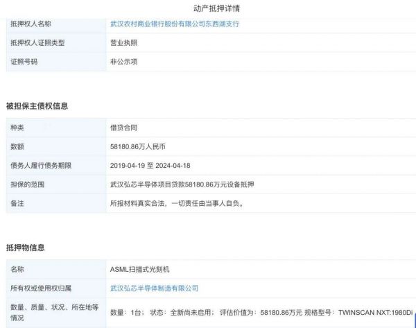 2019 年 12 月,武汉弘芯高调宣布购买目前国内最先进的光刻机设备 ASML 光刻机,这台设备价值 5.8 亿元,是大陆唯一的一台 7nm 光刻机,只可惜尚未启用就被用于抵押,这也成为本次舆论的焦点话题。