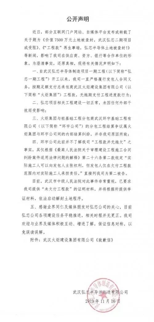 2019 年 7 月 4 日,弘芯一期工程举行封顶仪式。但是,“火炬集团并未结清工程款,” 环宇公司高层向媒体表示,“火炬集团拖欠环宇公司 4100 万工程款长达一年。” 因拖欠工程款,环宇公司向武汉市中级人民法院起诉火炬集团及弘芯,并于 2019 年 9 月 4 日向法院申请诉前财产保全。9 月 12 日,法院裁定冻结火炬集团总计存款额度为 3500 万元的 3 个银行账户,并裁定查封弘芯的二期工程用地,裁定立即执行。