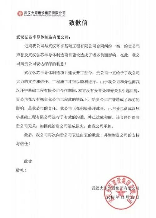 随后,武汉火炬建设集团有限公司也发布了一则道歉声明。