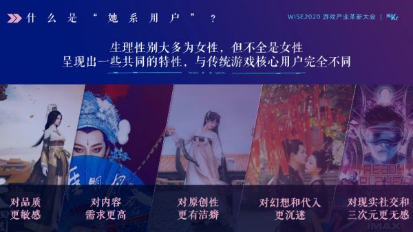 最近我看了很多研究和洞察,包括一些行业的报告,大家都关注到了同一群人,可能关注点不一样,有些人会说“泛用户”,有些人会说“内容敏感用户”,还有说新文化相关的内容和用户,这里是我提出一个词——“她系用户”。在这近十年间我面对的都这样一群用户,为什么会这样?因为我的游戏有很多这样的用户。“她系用户”的生理性别并不都是女性用户,但他们的很多行为模式和表现与前几年行业中常提的女性用户有类似的地方,所以我们称其为“她系用户”。他们有各种的特质,他们的敏感点对研发和品宣、内容定位项有比较重要的参考价值。