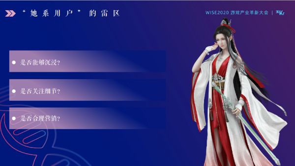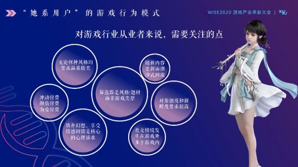 IP时代“她系用户”渐渐获得广泛关注,游戏制作者也不例外,腾讯互动娱乐《天涯明月刀》IP架构师顾婷婷认为,他们身上的特性以及行为模式与传统游戏的核心用户完全不同,并对IP的形成以及活力保持有着重要的价值和意义。