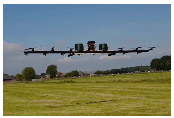作为一种替代方案,Drone4Agro公司制造了一架多旋翼原型机,该机机翼长达6米(19.7英尺),有16个螺旋桨/马达,可携带50升液体,并结合了一台Loweheiser二冲程电子燃油喷射发动机和一台电动发电机。该发电机又为螺旋桨的电动马达提供动力。