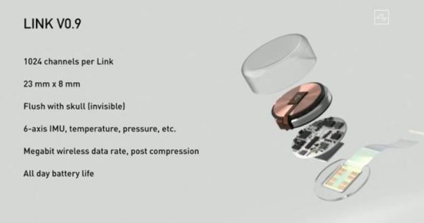 作为本次发布会主角之一的Link V0.9,其直径为23毫米,厚度8毫米,拥有1024路连接,能够感应温度气压,并读取脑电波、脉搏等生理信号,可以置于人脑的颅顶部位。马斯克将其描述为“就像头骨上的Fitbit”。