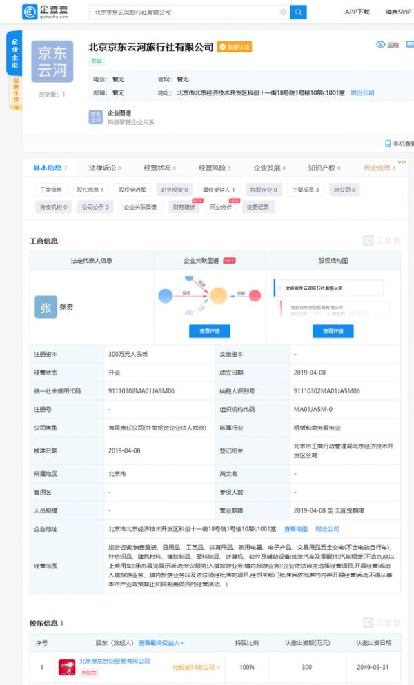 36氪讯,企查查数据显示,北京京东世纪贸易有限公司新成立一家北京京东云河旅行社有限公司。北京京东云河旅行社有限公司成立于4月8日,注册资本300万元,京东001号员工张奇为该公司法定代表人、执行董事及经理,京东首席合规官李娅云出任该公司监事。该公司经营范围涉及旅游咨询、入境旅游业务、境内旅游业务等。