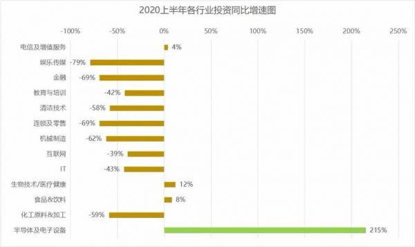 2020年上半年,半导体产业已经位居各行业投资同比增速之首,达到惊人的215%。