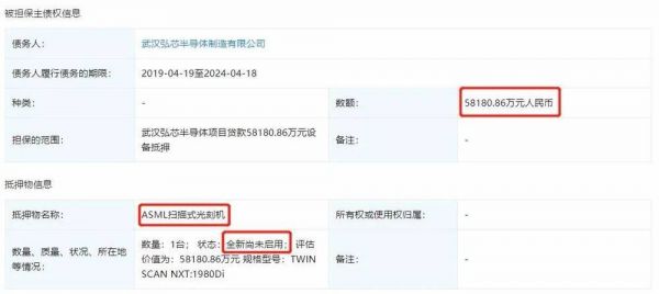 但值得注意的是,今年1月,弘芯刚刚进场一个多月的大陆唯一一台7nm光刻机转手就被抵押,根据企查查上的动产抵押显示,金额高达5.8亿元,而且是全新尚未使用。