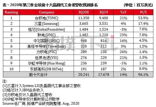 前十大晶圆代工厂商Q3营收排名预测,图源:TrendForce