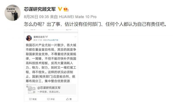 芯谋研究首席分析师顾文军也在微博上针对弘芯事件表示无奈,“出了事,估计没有任何部门、任何个人认为自己有责任。”