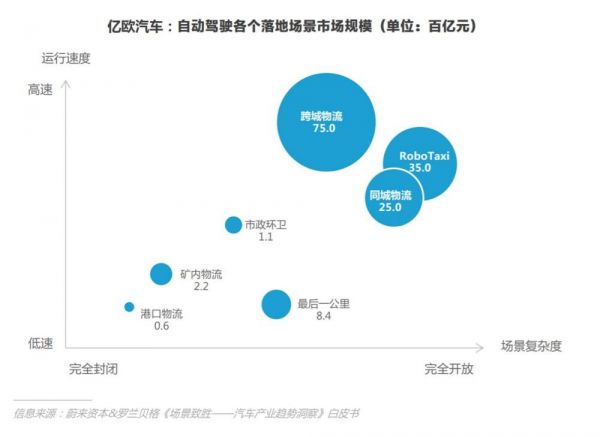 据蔚来资本测算,自动驾驶在智慧城市、物流、公共出行等方面具有广阔的发展前景,而它在跨城物流、RoboTaxi和同城物流等方面更是分别达到7000亿元、3500亿元、2500亿元的市场规模。