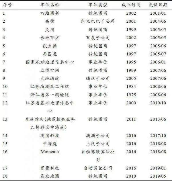 从2001国内第一家企业四维图新获得地图甲级测绘资质,到2019年底,全国仅有18加企业取得资质。而这其中,真正拥有完整的地图制作能力的公司又只有5家。