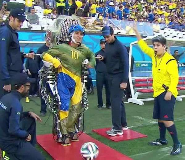 在巴西,一位瘫痪少年身穿特别设计的外骨骼为世界杯开球。—巴西世界杯实况转播 / 优酷网