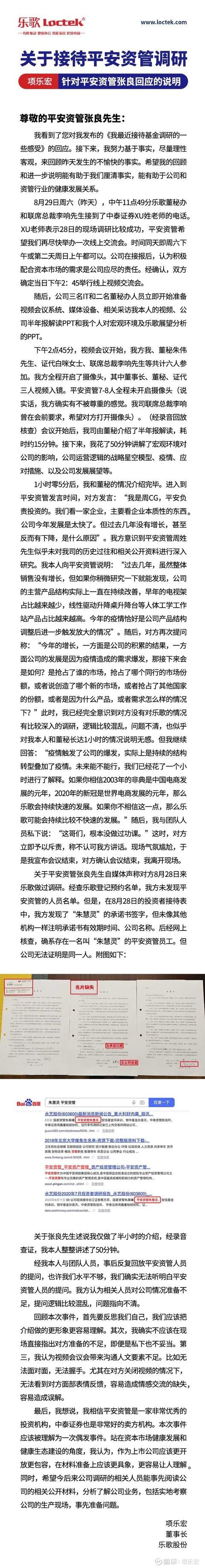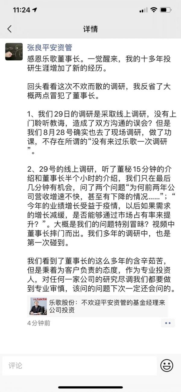 8月30日,平安资管资深投资经理张良也在朋友圈做出回应,称感恩乐歌董事长,并解释平安资管有做现场调研,不存在所谓的“没有来过乐歌一次调研”。