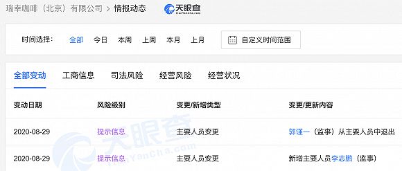据天眼查APP显示,8月29日,瑞幸咖啡(北京)有限公司发生主要人员变更,瑞幸咖啡CEO兼董事长郭谨一卸任公司监事,李志鹏接任。