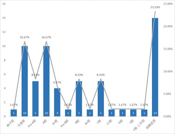 从融资轮次看,项目依旧集中在战略投资和早期融资,战略轮融资14笔(23.33%),较上周出现小幅回落;天使轮和A轮则均有10笔融资,各占比16.67%。