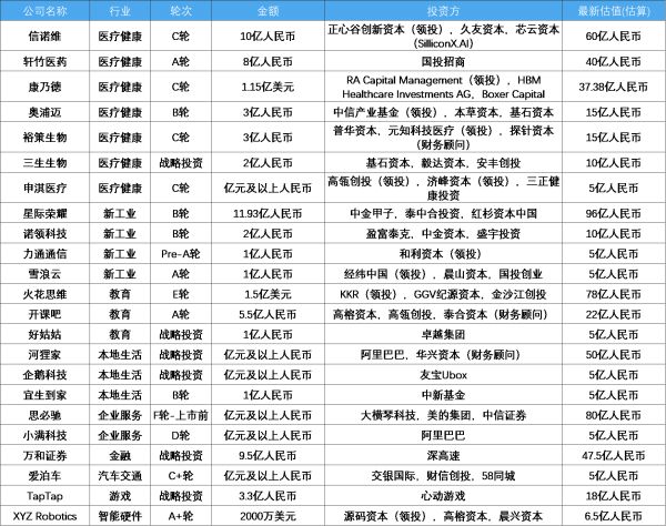 大笔融资集中在热门赛道。本周医疗健康、新工业、教育赛道均出现了大笔融资,其中融资额最高的「星际荣耀」获得由北京金融街资本运营中心领投,中金甲子、广合信诚、泰中合投资、红杉资本中国基金、中信证券、招商证券等跟投,老股东经纬中国、鼎晖投资、甘泉资本等继续跟投的11.925亿人民币B轮融资。作为国内第一梯队的民营商业航天企业,星际荣耀是中国第一家也是目前唯一一家迈过“入轨”这一运载火箭技术门槛的民营企业,本轮融资将主要用于双曲线系列运载火箭的研制、焦点系列可重复使用液氧甲烷发动机的研制以及人才队伍的建设培养等方面;医疗健康领域「信诺维」完成正心谷资本领投的10亿元C轮融资,用于推动正在进行的国内外临床试验、早期项目的临床前研发以及生产基地的建设。