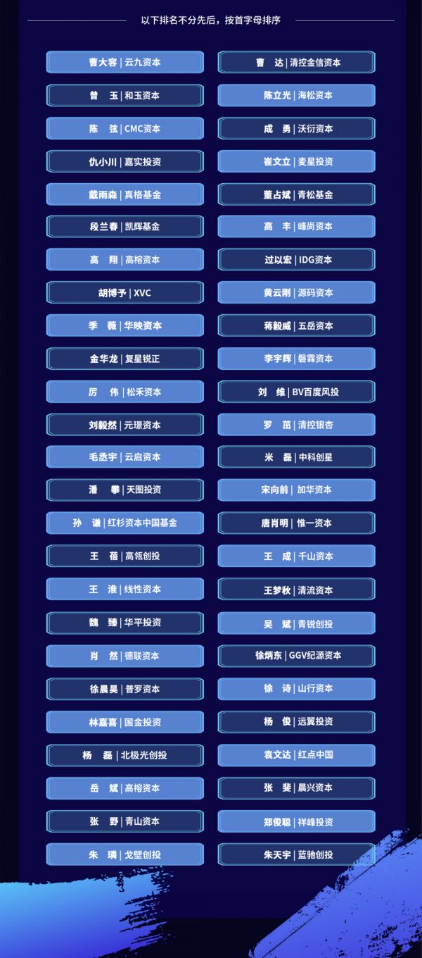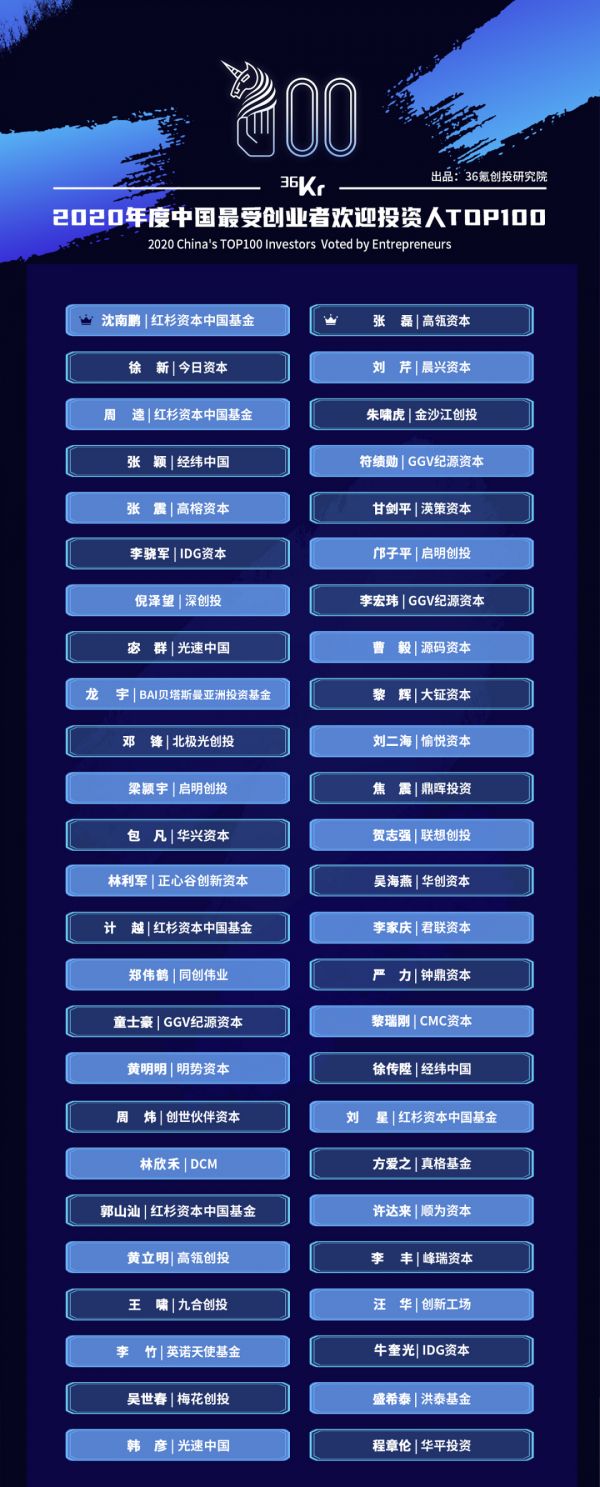 另外,36氪也从千位投资人中按照基金募资能力、项目投资能力、项目投后管理能力及最终退出项目回报水平等指标综合考量,结合创业者关注热度,甄选了100位最受创业者欢迎的卓越投资人。