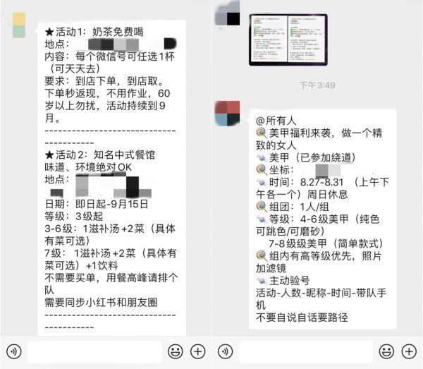 在C站加入的某个福利群中,最低Lv3就可以报名免费试吃。群内的活动吃喝玩乐、美妆美发,无所不包。唯一的要求就是在体验结束后“交作业”,即在点评上发布带图评价。不交作业或者报名之后没有去的“鸽子”会被移出群聊。