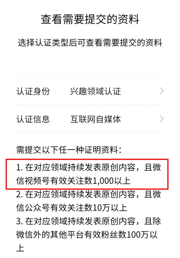 兴趣领域认证一项可选择认证条件变更:在对应领域持续发布原创内容,且微信视频号有效关注数在1000以上。