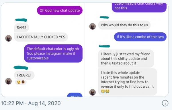 图注:Instagram更新后,发件人在发送信息时,其信息框会在蓝色及紫色之间变换(来源:Thenextweb.com)